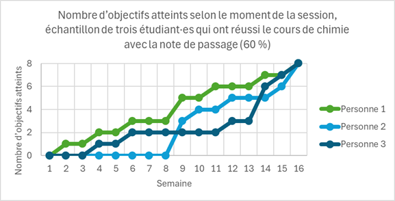 Le graphique suivant est tiré de nos données de recherche et concerne un cours de première session dans le programme préuniversitaire de sciences de la nature donné en PAN. Il montre la progression du nombre d’objectifs atteints dans le cours, au fil des semaines de la session, pour trois personnes étudiantes. Ce que ces personnes ont en commun, c’est leur note finale : elles ont toutes obtenu la note de passage de 60 % (ce qui correspondait, dans ce système, à l’atteinte de 8 objectifs). Ce qui est toutefois très différent, ce sont les parcours de ces trois personnes.